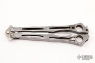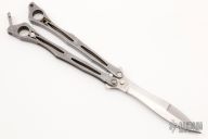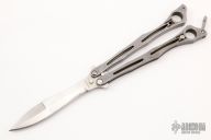 This Spyderfly Balisong by Spyderco features a satin finished spear point VG-10 blade with a false top edge. The handles are bead blasted stainless steel with a tip up clip (4-way reversible). Has scuffs and scratches, has been resharpened, great condition otherwise.