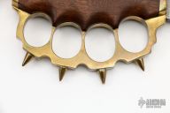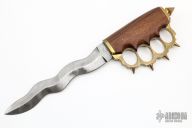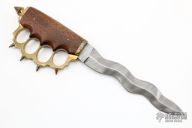 This Damascus Kris Trench Knife by Daryl Hibben features a Devon Thomas Damascus kris blade with .249" blade stock and 1.265" blade depth, hidden tang construction. The handle is comprised of spiked brass knuckles, pinned wood covers, brass spike on pommel. One of the brass spikes is lightly blunted.  Has some patina on the brass. Excellent condition.