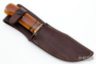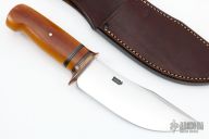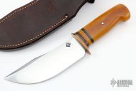 This Woodcraft from Rocco Handmade features a satin finish blade with swedge, .144" bladestock and 1.62" blade depth, and hidden tang construction. Has copper guard, copper spacers, black and aluminum spacers, vintage paper micarta handle and stainless pin. Comes with a Treeman leather shop sheath. Has some patina on the guard. Excellent condition.