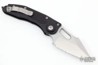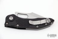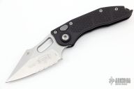 This Stitch Auto by Microtech Knives features a stonewash finished blade and false top edge, notched thumb and finger rests. The handle has a black milled aluminum handle with a bead blasted titanium backspacer and a bead blasted stainless  steel clip, tip up carry, lanyard hole at the butt. Comes with original box and papers. S/N of 9702 and dated 03/2022. Excellent condition.
