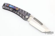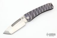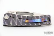 This Marauder by Medford Knives features a satin tanto blade with fullers. The handle has a textured and anodized titanium frame with a D2 skull crusher at the butt and tip up flamed titanium clip. Nice detent, lockup and blade seating. Comes with a Medford box and hardcase. Has a couple of light scratches, otherwise excellent condition.