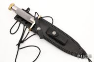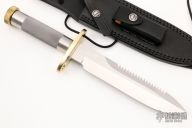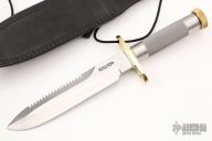 This Model 18-7.5 Attack Survival from Randall Made Knives has a 7.5" blade with sharpened top edge and sawteeth, .234" blade stock and 1.359" blade depth, hidden tang construction. The handle has a brass guard and knurled butt cap, knurled stainless steel handle. Compass in the butt cap. Comes with a black leather sheath and original paper wrapping. New from maker.