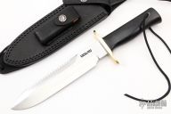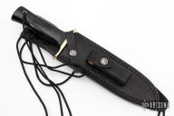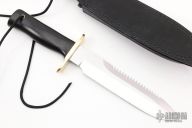 The Model 14-7.5 by Randall Made Knives features satin finished blade with sawteeth, .218" blade stock and 1.436" blade depth, full tang construction. The handle has a double brass guard, and black linen micarta grip with a lanyard hole. Comes with original black leather sheath and paper wrapping. New from maker.