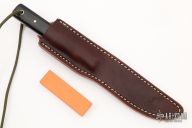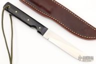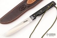 This Model 10 Salt Fisherman and Household Utility features a satin finish drop point blade with swedge and notched thumbrest, .143" blade stock and .905" blade depth. The handle is comprised of black linen micarta scales over full tang construction. Brass lanyard tube with lanyard in pommel. Includes a brown leather sheath and sharpening stone. New from maker. Comes with original paper wrapping.