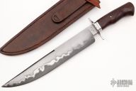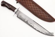 This Bowie by Journeyman Smith Jim Poling features a San Mai Damascus blade with false top edge, (1084 and 416 SS) .273" blade stock and 1.642" blade depth, hidden tang construction. The handle has a stainless steel guard and collar with stabilzied and dyed maple burl grip. Comes with a brown leather sheath and zippered case. New from maker at the 2022 Blade Show West. Coems with a COA dated 10/7/22