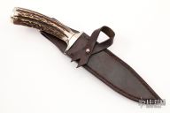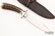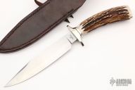 This Fighter by Journeyman Smith Jim Poling features a hand rub satin finished blade with false top edge, .217" blade stock and 1.189" blade depth, hidden tang construction. The handle has a nickel silver guard with copper spacer, stag grip and a nickel silver butt. Comes with a brown leather sheath and zippered case. New from maker at the 2022 Blade Show West. Comes with a COA dated 10/7/22.