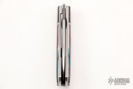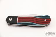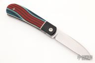 This Zulu Front Flipper by Enrique Pena features a hand rub satin finished blade with swedge, notched thumbrest and front flipper. The handle has black linen micarta bolsters, crazy canvas micarta scales over white liners, black linen micarta backspacer. Stainless Steel Shield.  Includes a Velcro case. New from Maker!