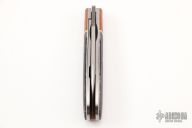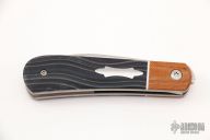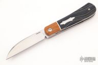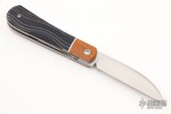 This Swayback Front Flipper by Enrique Pena features a hand rub satin finished wharncliffe blade with swedge, notched thumbrest and front flipper. The handle has canvas micarta bolsters, micarta scales over white liners, canvas micarta backspacer. Stainless Steel Shield.  Includes padded and zippered case. New From Maker!
