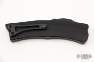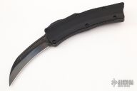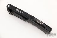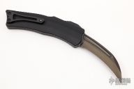 This Custom ROC by Heretic Knives features a hand ground DLC coated blade with fullers and notched thumbrest. The handle has a black aluminum chasis with atip down DLC titanium clip with ceramic ball. Fat Carbon Black Dunes inlay in the push button. Comes with original box and COA #111. New from maker at the 2022 Blade Show West.