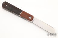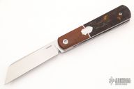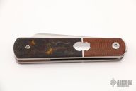 This Barlow Front Flipper Linerlock by Enrique Pena features a hand rub satin finished blade with front flipper and notched thumbrest. The handle has micarta bolsters, micarta scales with a stainless steel escutcheon, white liners, titanium liners and natural canvas micarta backspacer. Comes with a zippered case. New from Maker!