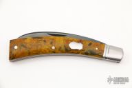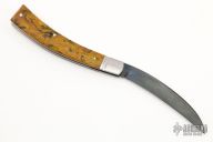 This Pruner by Daniel Keown features a blued hawkbill blade with nail nick. The handle has 416 stainless steel bolsters with integral liners, Antique Westinghouse Rag Micarta covers, stainless steel escutcheon, blued A2 spring, stainless steel pins. Has half-stop, flush in all positions. Comes with a zippered case. New from maker at the 2022 Blade Show West.