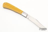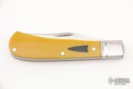 This Trapper by Bill Ruble features a hand rub satin finished clip point blade with a nail nick. The handle features fluted stainless steel bolsters, vintage Westinghouse linen micarta covers with black liners, black paper micarta escutcheon, stainless steel liners and spring. Has half-stop, flush in all positions. Includes a zippered case. New from maker at the 2022 Blade Show West.