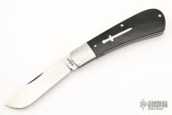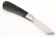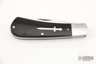 This Trapper by Kabisch Custom Knives features a hand rub satin finished blade with nail nick. The handle has stainless steel bolsters and liners, black paper micarta covers with stainless steel sword escutcheon, stainless steel spring. Has half stop, flush in all positions. Comes with a zippered case. New from maker at the 2022 Blade Show West.