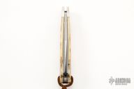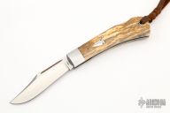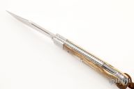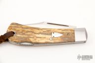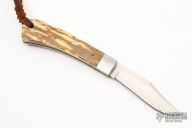 This Lockback from Tobin Hill features a hand rub satin finished clip point blade with nail nick. The handle has pinched stainless steel bolsters with beautiful mammoth ivory scales with black liners, stainless steel escutcheon, stainless steel liners with fileworked spines, stainless steel backspacer/lockbar. Includes padded and zippered case. New from maker at the 2022 Blade Show West.