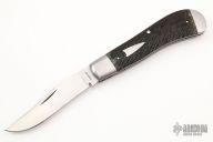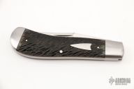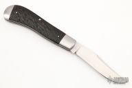 This Prototype Trapper by Tim Robertson features a hand rub satin finished blade with nail nick and false top edge. The handle has stainless steel bolsters, jigged bone covers, stainless steel liners and spring. Has half-stop, flush in all positions. Comes with a zippered case. New from maker at the 2022 Blade Show West. Marked "0" on the ricasso.
