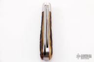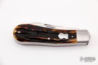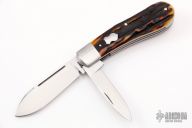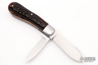 This Dogleg Jack by Jim Dunlap features 2 hand rub satin finished blades with nail nicks. The handle has pinched stainless steel bolsters, stag covers, stainless steel liners and springs. Half-stop is flush in all positions. Includes padded zippered case. New from maker at the 2022 Blade Show West.