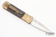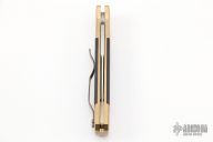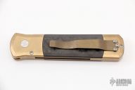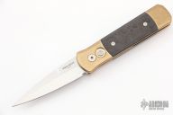 This 7114-CAMO Godson from Pro-Tech Knives features a satin finished blade with swedge. The handle has a stonewashed bronze frame with Camo Fat Carbon inlays, anodized and stonewashed titanium tip up pocket clip and a black-lip-pearl button.  New From Maker!