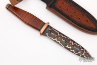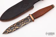 This Dagger by Jason Donahue features a CuMai Damascus double edged blade with bold copper bands, .183" bladed stock and 1.043" blade depth, hidden tang construction. The handle has a copper guard and butt, stacked leather grip with black/green G-10 spacers. Comes with a hand tooled brown/black leather sheath. New from maker at the 2022 Blade Show West.