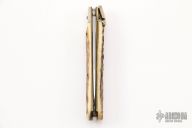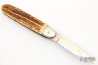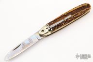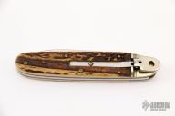 This leverlock auto by Hubertus features a mirror polished blade, nickel silver bolsters, stag scales, and brass liners and pins. Has some scratches on the blade, otherwise good condition.