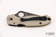 This Paramilitary 3 Linerlock Folder from Spyderco has a black blade with thumbhole and notched thumbrest. Handle has tan G-10 scales with nested stainless steel liners and black stainless steel 4-way reversible clip. Comes with original box and papers. New condition.