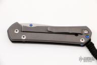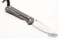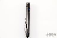 This large Sebenza 21 features a tumble finish blade and a bead blast titanium and carbon fiber frame. Bead blast titanium clip, tip up carry. Has blue thumbstud and barrel spacer. Comes with original box and papers dated October 24, 2012. Excellent condition.