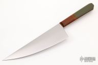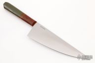 This Chef Knife by Auxiliary Manufacturing features a satin finished blade with .104" blade stock and 2.283" blade depth, full tang construction. The handle has brown linen micarta bolsters, green G-10 scales, brown linen micarta spacers and liners, and a translucent G-10 band in the middle of the scales. Comes with a zippered case. New from maker at the 2022 Blade Show West.
