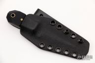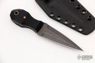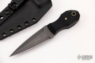 This Pocket Rocket by Auxiliary Manufacturing features an acid tumbled double edged blade with .133" blade stock and .895" blade depth. The handle has black linen micarta scales with brass pins. Comes with a kydex sheath with clip. New from maker at the 2022 Blade Show West.