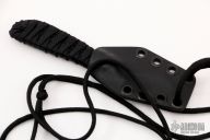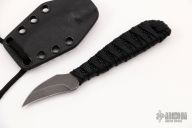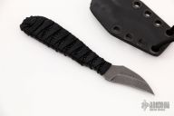 This Tsume by Auxiliary Manufacturing features an acid tumbled blade .112" blade stock and .728" blade depth. The handle has epoxied black cord wrap over black stingray skin. Comes with a kydex neck sheath. New from maker at the 2022 Blade Show West.