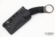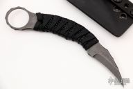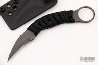 This Karambit by Auxiliary Manufacturing features an acid tumbled blade with textured spine, .134" blade stock and .780" blade depth. The handle has epoxied black cord wrap over black stingray skin. Comes with a kydex neck sheath. New from maker at the 2022 Blade Show West.