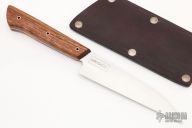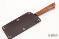 This Petty knife by Broco Knives features a hand rub satin finished Sandvik 19C28N blade with .081" blade stock and 1.325" blade depth, full tang construction. The handle has Urunday wood scales with copper pins. Coems with a leather slip sheath and COA. New from maker at the 2022 Blade Show West.