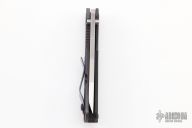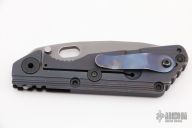 This DDC SNG by Duane Dwyer features a HipTiNite SM-100 drop point chisel ground blade with thumbhole, and dual thumbstuds. The handle has a milled and anodized titanium frame with milled g10 scale, and anodized reversible tip up clip. Comes with a zipper pouch with patches, and makers card. Has some light scuffs on the blade and handle otherwise great condition.