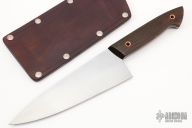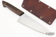 This Chef knife by Broco Knives features a hand rub satin finished Bohler K720 steel blade with .080" blade stock and 2.360" blade depth, full tang construction. The handle has Pau Santo wood scales with copper pins. Comes with a leather slip sheath and COA. New from maker at the 2022 Blade Show West.