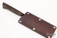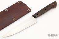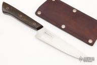 This Petty knife by Broco Knives features a hand rub satin finished Sandvik 19C28N blade with .081" blade stock and 1.359" blade depth, full tang construction. The handle has Pau Santo wood scales with copper pins. Coems with a leather slip sheath and COA. New from maker at the 2022 Blade Show West.