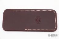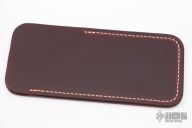 This brown leather slip sheath by Robertson Leather Works is 5.5" long by 2.5" wide. New from maker at the 2022 Blade Show West.