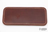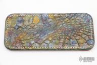 This leather slip sheath by Robertson Leather Works features hand dyed alligator skin. It is 5.5" long by 2.5" wide. New from maker at the 2022 Blade Show West.