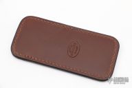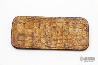 This leather slip sheath by Robertson Leather Works features hand dyed alligator skin. It is 4.75" long by 2.25" wide. New from maker at the 2022 Blade Show West.