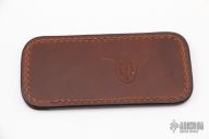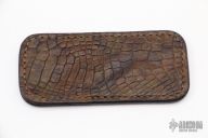 This leather slip sheath by Robertson Leather Works features hand dyed alligator skin. It is 4.25" long by 2" wide. New from maker at the 2022 Blade Show West.