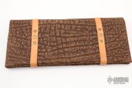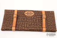 This 12-Knife Case by Robertson Leather Works is made from Cape Buffalo Leather. It has leather straps with buckles. The pockets are 5" by 2.25". New from maker at the 2022 Blade Show West.
