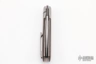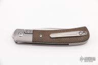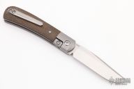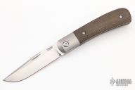This Trapper Front Flipper by Enrique Pena features a satin finished blade with a front flipper and notched thumbrest. The handle has titanium bolsters, green micarta scales with a titanium backspacer and matching tip up pocket clip. Includes a Pena X-Series padded box and micro fiber cloth. Excellent condition.