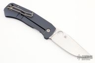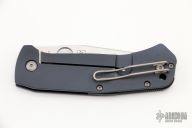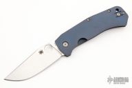 This Slysz Bowie by Spyderco features a tumble finished blade with notched thumbrest and thumbhole. The handle has a blue anodized titanium frame with notched black G-10 backspacer and tip up, left or right reversible clip. Nice detent, lockup and blade seating. Includes the original box and papers. Knifejoy Edition. Has some light scuffs and scratches, otherwise excellent condition.
