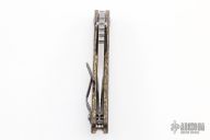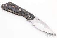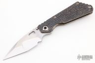 This SNG framelock folder by Mick Strider features a stone washed/satin finish blade with nightmare grind. The handle features textured, anodize and carved titanium frame and tip up titanium clip. Includes a "Lock Bar Stabilizer" for maximum reverse lock retention. Nice detent, lockup and blade seating. Has a couple light scuffs and scratches, excellent condition otherwise.