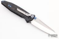 This Socom Elite Warcom by Marfione Custom Knives features a mirror polish blade with notched thumbrest and dual thumbstuds, satin finished flats. The handle has a fat carbon frame with a tip down satin finish stainless steel clip and liner, blue anodized titanium hardware and backspacer. Nice detent, lockup and blade seating. Comes with original box, zippered case and papers. Dated 03/2022 and S/N 018. Excellent condition.
