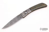 This linerlock folder by Cliff Parker features a Damascus blade with a gold single thumbstud. The handle has Mosaic Damascus bolsters, mammoth ivory scales, anodized and fileworked titanium liners, and a Damascus backspacer. Nice detent, lockup and blade seating. Excellent condition.