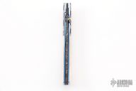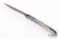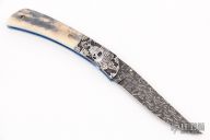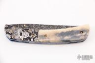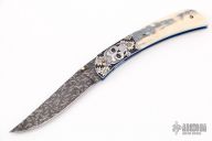 This knife by Jody Muller features a Mosaic Damascus blade with a single gold thumbstud. The handle has engraved and gold inlaid stainless steel bolsters, walrus ivory scales, anodized titanium liners, and an engraved and gold inlaid stainless steel backspacer. Nice detent, lockup and blade seating. Excellent condition. Engraving done by Jody Muller.