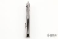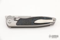This Mini Tempest from Brian Nadeau features a hand rub satin finished drop point blade with a fuller and notched thumbrest/front flipper. The handle has a bead blasted titanium frame with Marvel Blue FatCarbon inlays, satin titanium tip up clip. Nice detent, lockup and blade seating, stainless lockface insert. Includes original box. Excellent condition.