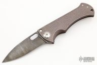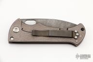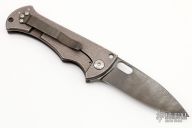 This Tracker Dan Bloodshark by John Gray is a collaboration with Tracker Dan, it features a distressed finished blade with thumbhole. Nitro V at 61 RC. The handle has a bark finished titanium frame with a three hole tip up clip. Nice detent, lockup and blade seating. Comes with a zippered case. Excellent condition.