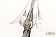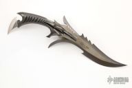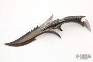 The Tiger Shark was the 2002 edition in the annual "Hibben Fantasy Knife Series," designed by master knife maker Gil Hibben. It is a beautifully designed work of art produced using the finest grade materials and workmanship. Features include six uniquely designed stainless steel blades and solid metal handle parts. The fantasy style main blade (with false-edged top) bears the precision laser marked Hibben Knives logo and signature. This annual series is eagerly awaited by collectors each year and if you missed the 2002 Tiger Shark, this is your opportunity to complete your collection. United Cutlery, GH2014. Does not come with stand. Has a small nick in the blade, otherwise excellent condition.