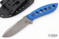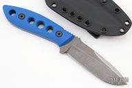 This Model 6 by Krein Knives features a stonewashed blade with notched thumbrest, .174" blade stock and 1.074" blade depth, full tang construction. The handle has blue G-10 scales with black hardware. Comes with a kydex sheath with TekLok. Excellent Condition.