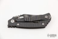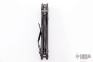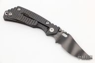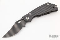 This PT Persian by Mick Strider features a tiger striped blade with notched thumbrest and thumbhole. The handle has a flame finished titanium frame with matching tip up clip. New from maker. Comes with a velcro case.