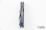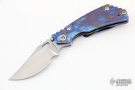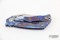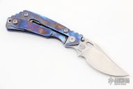 This PT Persian by Mick Strider features a stonewashed blade with notched thumbrest and thumbhole. The handle has a flame finished titanium frame with matching tip up clip. New condition. Comes with a velcro case.